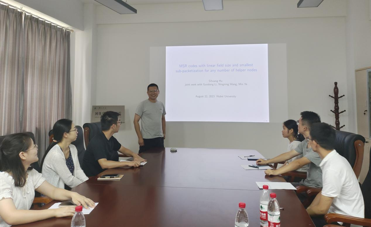 2023年8月22日,山东大学太阳成集团tyc151cc副院长胡思煌教授应邀为我院密码与编码学团队师生在数统学院403会议室作了题为《MSR Codes with Linear Field Size and Smallest Sub-Packetization for Any Number of Helper Nodes》的学术报告。
