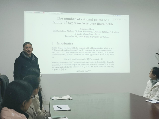 2023年12月18日上午,四川大学洪绍方教授应邀为我院师生作了题为《The number of rational points of a family of hypersurfaces over finite fields》的学术报告。