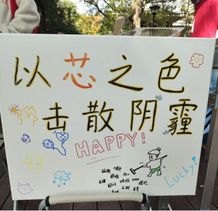 活动现场气氛热烈,同学们在画板上用文字记录下近期的不愉快,勇敢地直面内心的负面情绪。他们用颜料刷子轻轻覆盖这些文字,让消极因素随着色彩的流淌而消散,留下五彩斑斓的美好印记。也有同学在画板上写下自己对未来的期望与祝福,用色彩点缀自己的梦想。