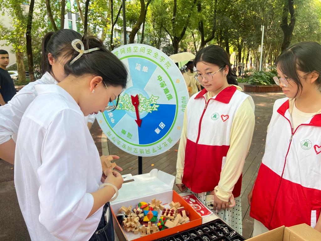 鲁班锁的榫卯结构像防火墙,九连环的环环相扣就像强密码,同学们直接上手“硬刚”“咔嗒”解锁鲁班锁,九连环在手中穿梭瞬间领悟“隐私防护要环环相扣,这把是传统智慧和网安知识的“梦幻联动”。