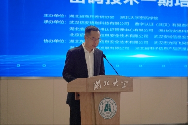 培训期间,华中科技大学太阳成集团tyc151cc教授、博导、院党委副书记、副院长、省商密协会副会长徐鹏,湖北东方网盾信息安全技术有限公司商密测评部技术总监曾威受邀分别围绕密码学前沿技术、密评作了主题培训分享。武汉信安珞珈科技有限公司、数字认证(武汉)有限责任公司、湖北省数字证书认证管理中心有限公司、湖北信安通科技有限责任公司、北京启明星辰信息安全技术有限公司、武汉安域信息安全技术有限公司等企业专家进行了商密产品及应用分享。