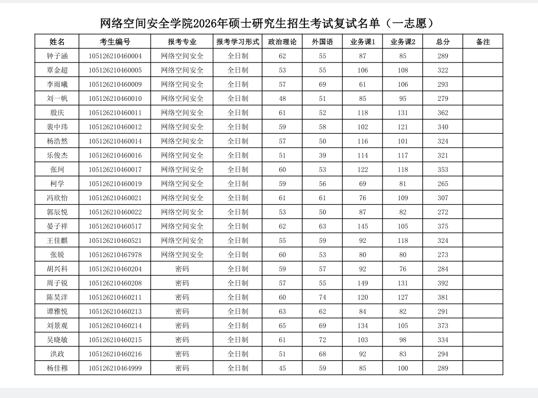 太阳成集团tyc151cc2026年硕士研究生招生考试复试名单(一志愿)