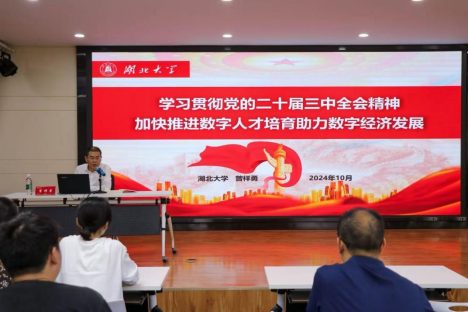 曾祥勇以《学习贯彻党的二十届三中全会精神加快推进数字人才培育助力数字经济发展》为主题,围绕“深入学习贯彻党的二十届三中全会精神”“数字经济赋能新质生产力发展的战略选择”“高校在推进数字人才发展中的挺膺担当”等三个方面,对党的二十届三中全会精神进行了系统阐述,并聚焦当前我国数字经济的发展形势、数字经济赋能新质生产力发展的战略导向、数字人才培养的实践路径与高校担当等内容,对学习贯彻党的二十届三中全会精神进行了深入解读。